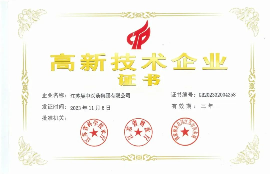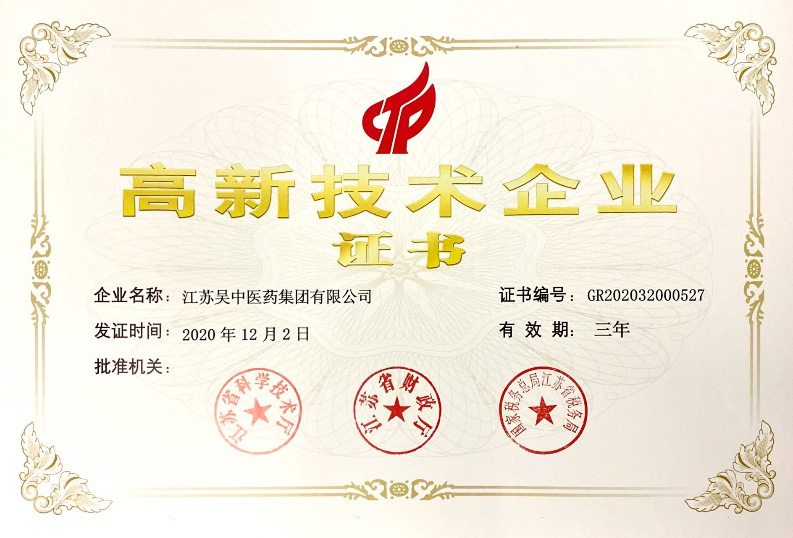 榮譽 :中醫藥獲評江蘇省高新技術企業