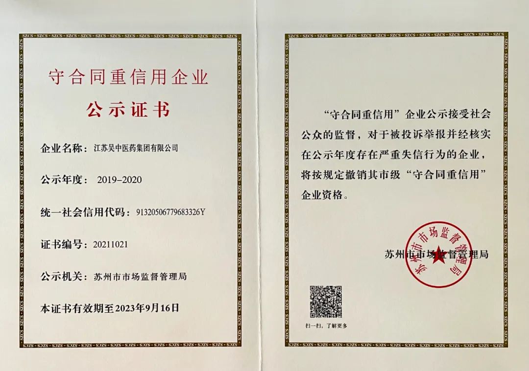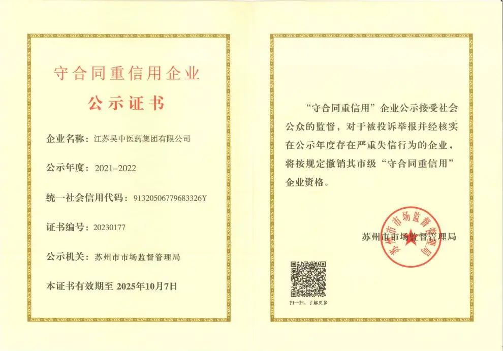 近日,江蘇吳中醫藥集團有限公司及其母公司江蘇吳中醫藥發展股份有限公司再度獲評2021-2022年度蘇州市“守合同重信用”企業,公司連續多年獲評,是公司守法經營、深入推動誠信建設、堅持誠信履約的重要體現,也是社會各界對企業長期誠信經營的肯定...