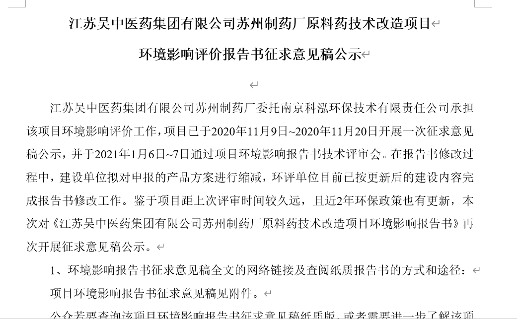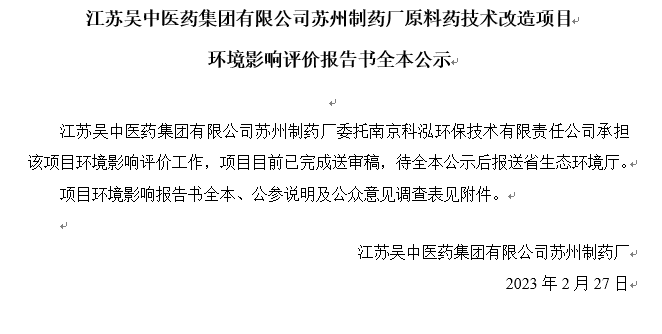 江蘇吳中醫藥集團有限公司蘇州制藥廠委托南京科泓環保技術有限責任公司承擔該項目環境影響評價工作,項目目前已完成送審稿,待全本公示后報送省生態環境廳...