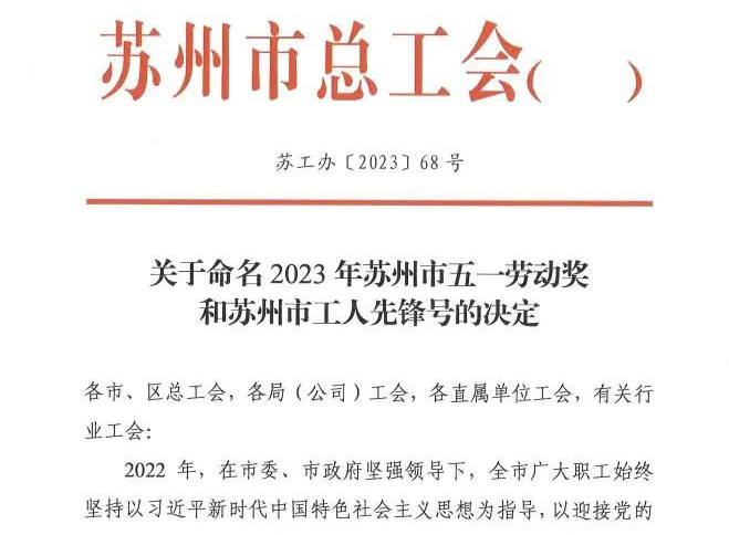 近期,蘇州市總工會印發《關于命名2023年度勞動和技能競賽、和諧企業創建先進單位和個人蘇州市五一勞動獎和蘇州市工人先鋒號的決定》,公司員工李慧榮獲“蘇州市五一勞動獎章”...
