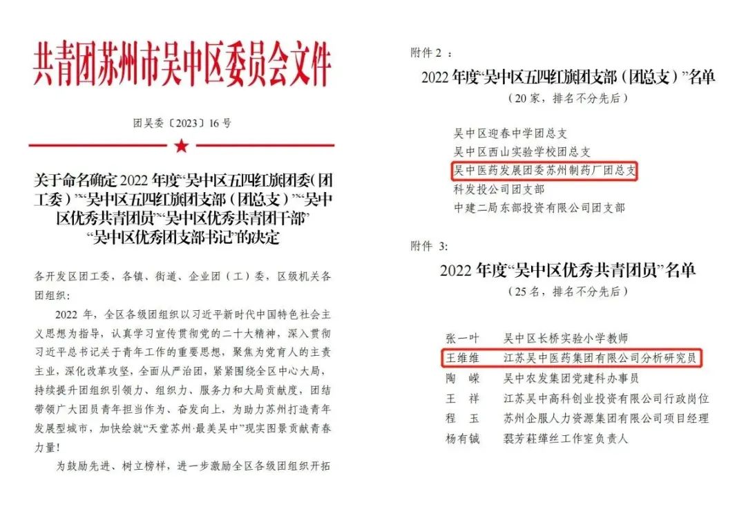 公司團委蘇州制藥廠團支部(團總支)和王維維同志分別在吳中區“兩紅兩優”評選中喜獲佳績