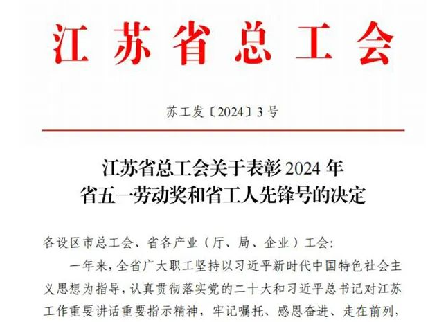 榮譽:母公司獲評江蘇省五一勞動獎狀