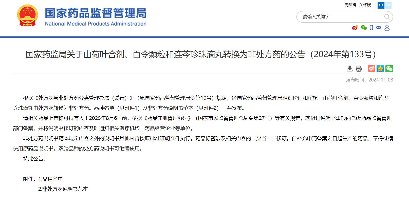 11月8日,國家藥品監督管理總局發布2024年第133號公告,根據《處方藥與非處方藥分類管理辦法(試行)》(原國家藥品監督管理局令第10號)規定,經國家藥品監督管理局組織論證和審核,公司下屬江蘇吳中醫藥集團有限公司蘇州制藥廠生產的連芩珍珠滴丸由處方藥轉換為非處方藥...