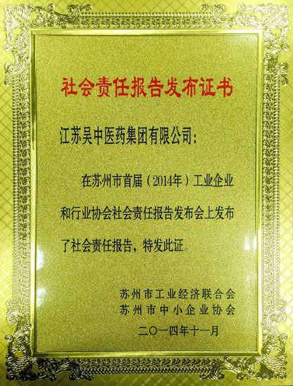 12月9日,在蘇州首屆(2014年)工業企業和行業協會社會責任報告會上,江蘇吳中醫藥集團有限公司發布社會責任報告。