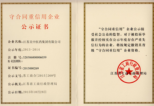 江蘇吳中醫藥集團有限公司獲得江蘇省守合同重信用企業,公司將接受社會公眾的監督,進一步提高企業的誠信意識和信用管理水平,發揚成績開拓進取,為經濟發展作出積極貢獻。