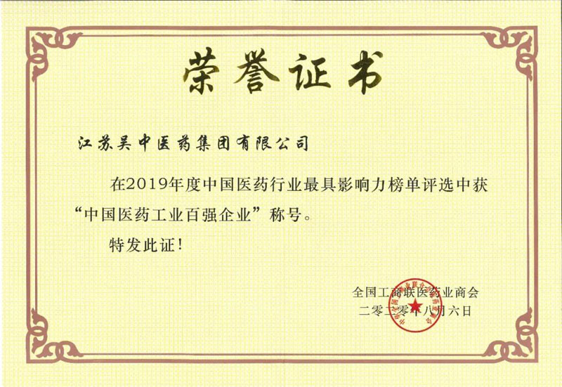 2020年8月7日,2019年度中國醫藥行業最具影響力榜單發布,江蘇吳中醫藥集團有限公司入選“中國醫藥工業百強企業”。