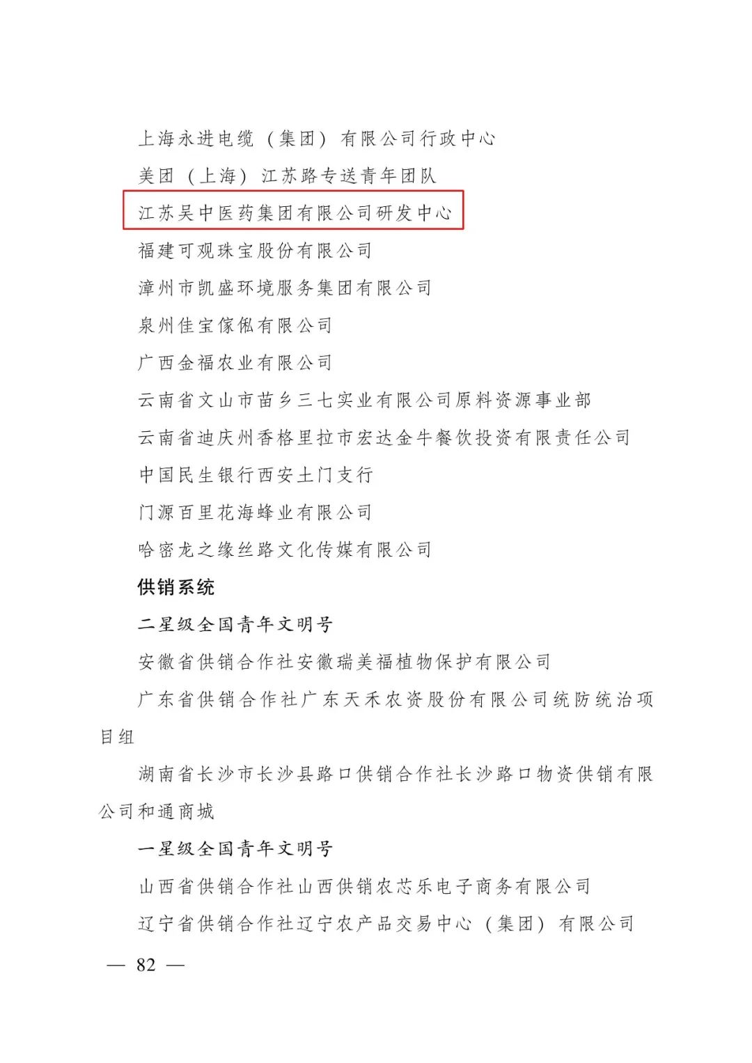 近日,共青團中央等23家全國創建青年文明號活動組委會成員單位聯合印發《關于命名第21屆全國青年文明號并進行星級認定的決定》。江蘇吳中醫藥集團有限公司研發中心獲評為“一星級全國青年文明號”。