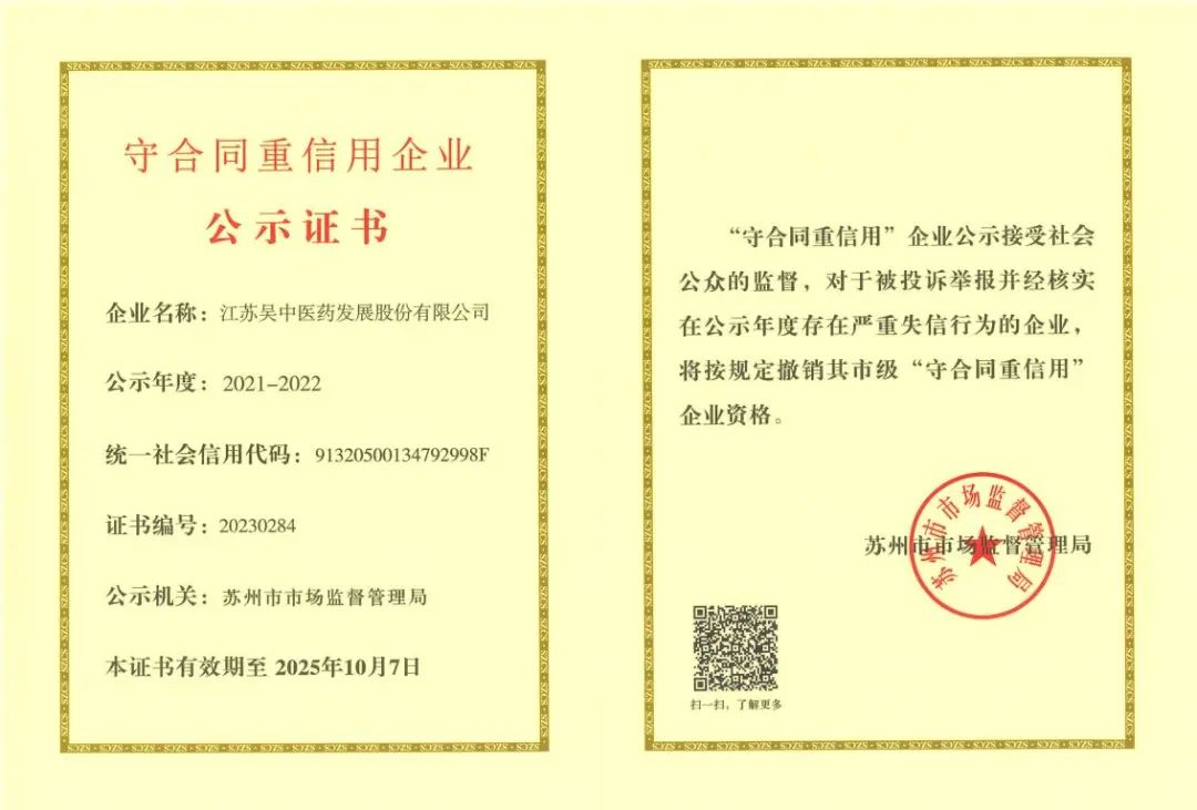 近日,江蘇吳中醫藥集團有限公司及其母公司江蘇吳中醫藥發展股份有限公司再度獲評2021-2022年度蘇州市“守合同重信用”企業,公司連續多年獲評,是公司守法經營、深入推動誠信建設、堅持誠信履約的重要體現,也是社會各界對企業長期誠信經營的肯定。