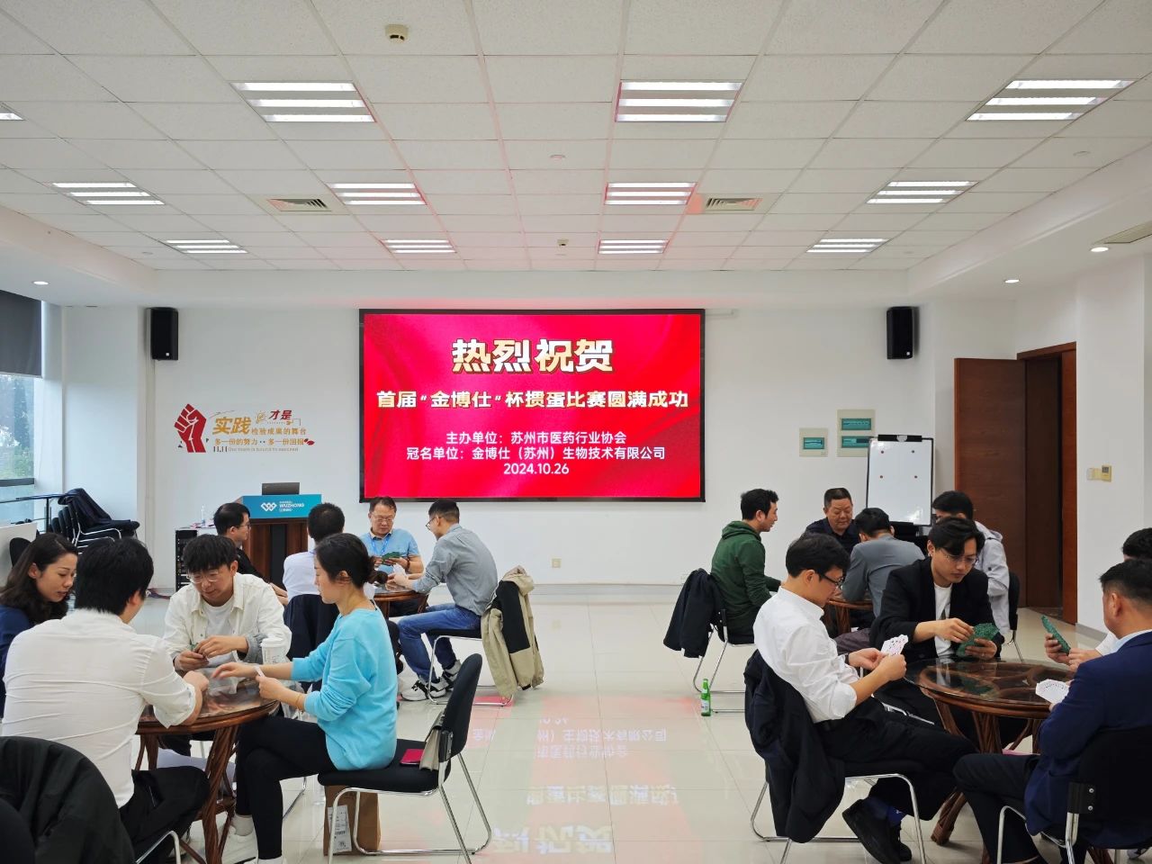 為了豐富會員的業(yè)余文化生活,增進會員之間的溝通交流,提升協(xié)會凝聚力,10月26日,蘇州市醫(yī)藥行業(yè)協(xié)會“金博仕”杯第一屆摜蛋比賽在江蘇吳中大廈舉辦,來自16家會員單位的32位選手參與角逐。本次比賽由蘇州市醫(yī)藥行業(yè)協(xié)會主辦,會員單位—金博仕(蘇州)生物技術(shù)有限公司提供贊助!