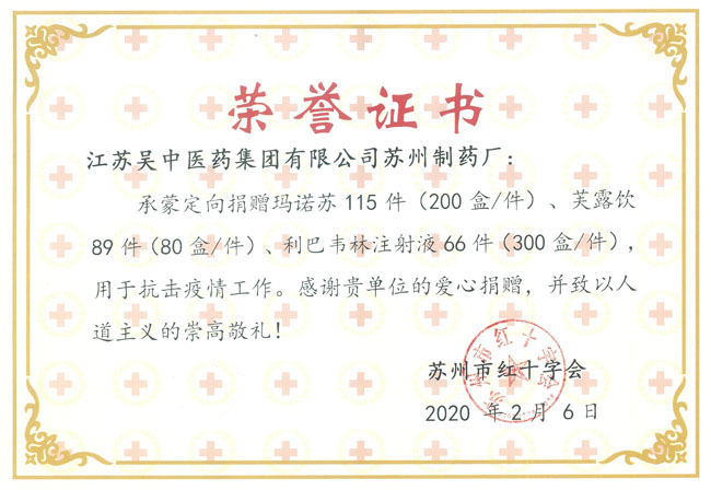 2020年4月17日,江蘇吳中醫藥集團收到中國國家博物館文物(圖片)征集收據,國務院應對新冠疫情聯防聯控機制(醫療物資保障組)向該企業發出的緊急任務調運單、蘇州市紅十字會頒發的捐贈證書以及吳中醫藥生產的特效“抑制藥”阿比多爾片三件物品被征集,未來將作為文物進行展出,公司抗疫貢獻再次被認可。